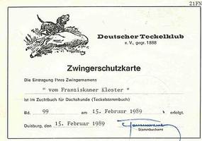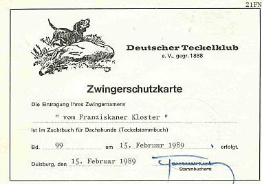 Am 15.02.1989 wurde der Zwinger "vom Franziskaner Kloster" vom Stammbuchamt bestätigt