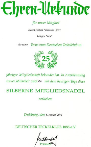 2014: Hubert ist seit 25 Jahren Mitglied im Deutschen Teckelklub 18888 e.V.